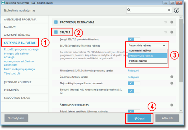 Sekite nurodytus punktus. Protokolų filtravimo režimą vietoj „Automatinis režimas“ pasirinkite „Interaktyvus režimas“.