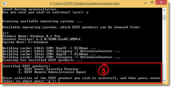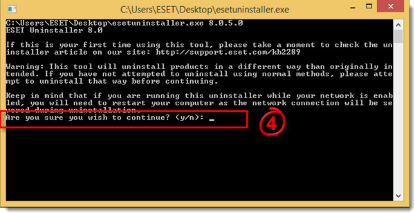 Paleiskite atsisiųstą „esetuninstaller.exe“ programą su administratoriaus teisėmis („Run as administrator“), įveskite „y“ ir spauskite „Enter“ klavišą klaviatūroje, sutikdami su įspėjimu, kaip parodyta žemiau pateiktame paveiksliuke: