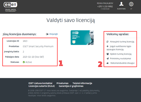 Prisijungus šiame puslapyje (suvedus licencijos raktą arba vartotojo vardą) matysite licencijos duomenys (1) ir veiksmų sąrašą (2):