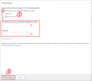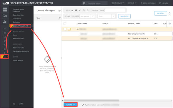 Jei jau esate pridėję EBA paskyrą į savo ESMC valdymo konsolę, tuomet nebūtina jos kelti iš naujo. Tokiu atveju ESMC konsolės dalyje More >License Administrator spustelėkite mygtuką Action ir pasirinkite Synchronize Licenses, kad priverstinai atnaujintumėte licencijos informaciją valdymo konsolėje. |