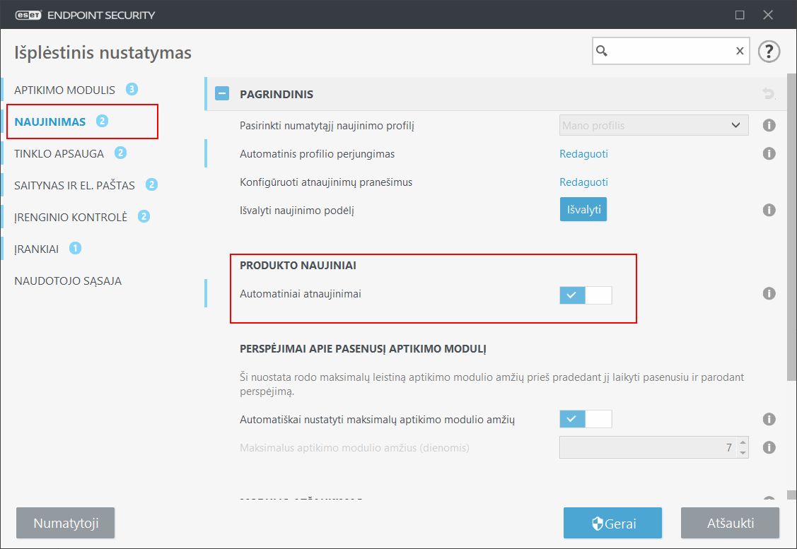 Pastaba: Įjungus šį funkcionalumą, ESET Endpoint Antivirus arba Endpoint Security produktas bus automatiškai atnaujintas tik praėjus 1-2 mėn. po naujausios versijos išleidimo.