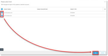 5. Pasirinkite kompiuterius, kuriuose norite atnaujinti ESET produktą ir paspauskite OK. Kitame lange pasirinkite kurį ESET produktą norite atnaujinti ir paspauskite OK.