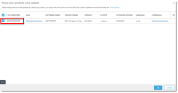 4. Pažymėkite laukelį šalia ESET produkto, kurį norite atnaujinti. Paspauskite Click to see the list, norėdami pamatyti kompiuterius, kuriuose bus atnaujintas ESET produktas.