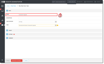 3. Laukelyje Name įveskite savo užduoties pavadinimą. Išskleidžiamajame meniu Task patikrinkite, ar pasirinkta Remote Administrator Components Upgrade reikšmė.