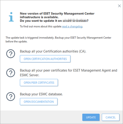 Kai ESMC serverio operacinė sistema atsinaujins (Alerts dalyje nebus rodomas pranešimas apie OS atnaujinimą), tuomet galite ESMC konsolės lango viršuje, dešinėje pusėje, paspausti ant HELP > Update Product ir paspausti mygtuką Update. Detaliau čia. Atnaujinimas gali trukti iki 20 min.