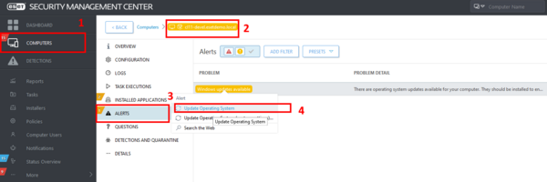ESMC konsolėje einame į Computers, čia surandame dinaminę grupę Linux computers (arba Windows computers > Windows (servers)) ir ant ESMC serverio paspaudžiame Show details. Atsidariusiame lange einame į Alerts ir paspaudę kairįjį pelės klavišą ant Operating System update available paleidžiame atnaujinimą.