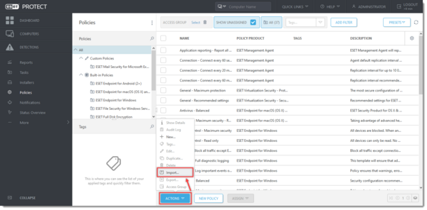 - Atsisiuntę mūsų paruoštas politikas, importuokite jas į ESET Protect web konsolę ir priskirkite kompiuteriams bei serveriams, turintiems naujausios versijos ESET verslo produktus su HIPS.