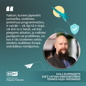 “Faktori, kuriem jāpievērš uzmanība, izvēloties pretvīrusa programmatūru, ir vairāki – cik ilgi tā ir tirgū, cik ērti to ir lietot, vai būs pieejams atbalsts, ja radīsies jautājumi vai problēmas, un kas ir tās izcelsmes valsts. Ieteiktu izvēlēties Eiropā izstrādātus risinājumus, nevis no valstīm, kurās nav īsti skaidrs, cik liela informācijas kontrole tiek īstenota no politiskās varas puses,” stāsta E. Rupenheits.