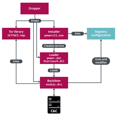 Vyveva utilise la bibliothèque Tor pour communiquer avec un serveur de commande et de contrôle. Le malware contacte le serveur à intervalles de trois minutes, envoyant des informations sur l’ordinateur victime et ses lecteurs avant de recevoir des commandes. « Les fonctions de la porte dérobée utilisées pour surveiller les lecteurs nouvellement connectés et déconnectés, et pour surveiller le nombre de sessions actives, dénotant les utilisateurs connectés, présentent un intérêt particulier. Ces composants peuvent déclencher une connexion au serveur de commande et de contrôle en dehors de l’intervalle préconfiguré de trois minutes, » explique M. Jurčacko.