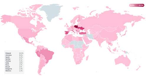 Au cours du premier semestre 2023, les pays les plus touchés par les logiciels malveillants AceCryptor étaient le Pérou, le Mexique, l'Egypte et la Türkiye. Le Pérou, avec 4 700, enregistrant le plus grand nombre d'attaques. Les campagnes de spam de Rescoms ont considérablement modifié ces statistiques au cours du second semestre de l'année. Les logiciels malveillants obscurcis avec AceKror ont touché principalement les pays européens.