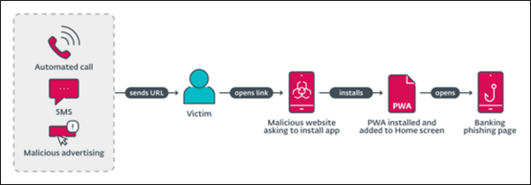De phishingcampagne en -methode zijn alleen mogelijk dankzij de technologie van progressieve webtoepassingen. Kort gezegd zijn PWA's applicaties die gebouwd zijn met behulp van traditionele webapplicatietechnologieën die op meerdere platforms en apparaten kunnen draaien. WebAPK's kunnen worden beschouwd als een verbeterde versie van progressieve webapps, omdat de Chrome-browser een native Android-toepassing genereert van een PWA: met andere woorden, een APK. Deze WebAPK's zien eruit als gewone native apps. Bovendien levert het installeren van een WebAPK geen enkele waarschuwing op voor“installatie van een niet-vertrouwde bron”. De app wordt zelfs geïnstalleerd als installatie vanaf bronnen van derden niet is toegestaan.