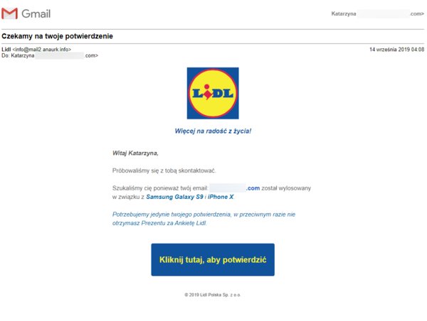 Jak informują eksperci z laboratorium antywirusowego ESET, w miniony weekend jeden z użytkowników zgłosił podejrzaną wiadomość adresowaną rzekomo przez sieć sklepów Lidl. Tytuł wiadomości od dyskontu wskazywał, że klient musi coś potwierdzić. Pomyślał: „brzmi intrygująco!”, dlatego postanowił kliknąć i sprawdzić treść wiadomości.