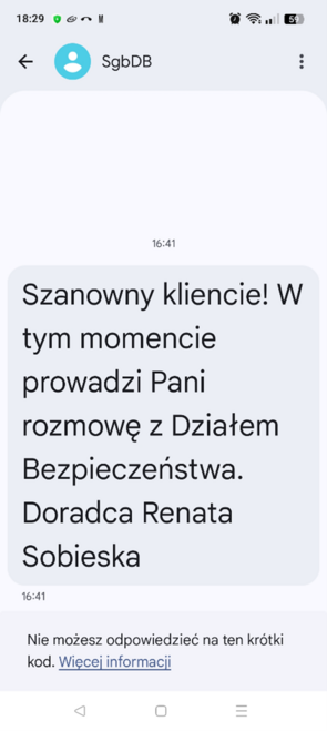 Pierwszym krokiem oszustów jest wiadomość phishingowa e-mail lub SMS o rzekomym problemie technicznym lub incydencie bezpieczeństwa. W wiadomości znajduje się link do instalacji fałszywej aplikacji bankowej na Androida. Dosłownie chwilę później oszust dzwoni, podając się za pracownika banku, aby „potwierdzić tożsamość” i uwiarygodnić instalację aplikacji. Użytkownik może również otrzymać SMS potwierdzający tożsamość rzekomego pracownika.
