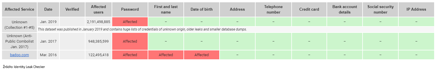 Katowiczanin z okazji Dnia Bezpiecznego Internetu przeczytał informację o niedawnym wycieku ponad 773 milionów danych z tzw. „Collection#1", które pochodziły z przeprowadzonych ataków. Zawierały adresy e-mail, hasła, imiona i nazwiska posiadaczy kont w różnych platformach oraz serwisach pocztowych. Postanowił sprawdzić na stronie Have I Been Pwned, czy jego e-mail jest na liście zagrożonych. Okazało się, że serwis wskazał, że jego adres e-mail jest bezpieczny. Dociekliwie szukał jednak innych, zaufanych stron, na których może zweryfikować swoje cyberbezpieczeństwo. Trafił na portal Identity Leak Checker, przygotowany przez niemiecki zespół badaczy bezpieczeństwa z Hasso Plattner Institut. Serwis w swojej bazie posiada ponad osiem miliardów rekordów pochodzących z różnych wycieków danych. Tym razem weryfikacja okazała się brutalnie szczera. Serwis wskazał, że w 2016 roku w wyniku ataku na serwis badoo.com, z którego raz w życiu skorzystał, wyciekły jego imię i nazwisko, data urodzenia oraz silne hasło (bo przecież składające się z dużych, małych liter, cyfr i znaków specjalnych), które wykorzystywał do logowania np. na Facebooku, Twitterze, czy do konta bankowego.