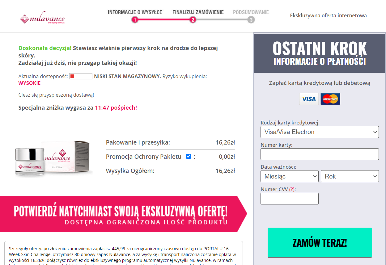 Fałszywy preparat o nazwie Nulavance nie usunie zmarszczek, a zainteresowanie nim może przyczynić się do utraty danych i pieniędzy. Po kliknięciu w grafikę, dołączoną do maila z reklamą, zostajemy przekierowani do formularza. Żąda on od nas m.in. podania szczegółowych danych teleadresowych, a w kolejnym kroku także danych karty płatniczej.