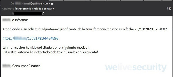 Emotet se distribuye principalmente a través de correos de phishing que incluyen un archivo adjunto. Este puede ser un documento de Word (.doc) o PDF, o un archivo comprimido (.zip), entre otros. Las campañas de phishing han ido variando. Por ejemplo, se han detectado campañas maliciosas relacionadas con el COVID-19, suplantando la identidad de bancos, así como también haciendo referencia nuevas funcionalidades para servicios donde los pasos a seguir se encuentran en el documento malicioso.