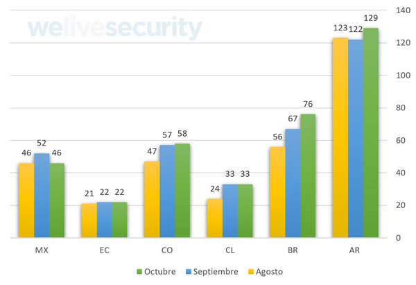 Emotet compromete sitios que son utilizados para la descarga de malware en el equipo de sus víctimas y también como servidores de C&C. De acuerdo con la información recolectada por las herramientas de ESET, se detectó que durante los últimos siete meses varios sitios en América Latina fueron comprometidos por Emotet, siendo los países más afectados Argentina, Brasil, México, Colombia, Chile y Ecuador.