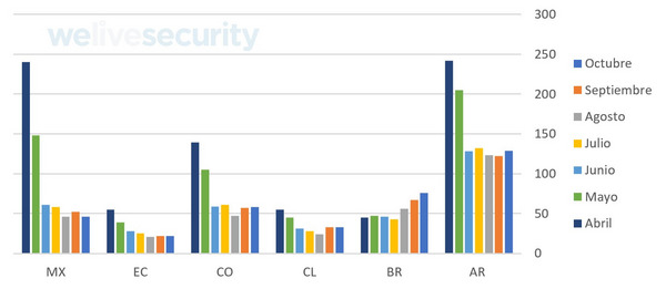 Pie de imagen: Países con más sitios comprometidos por Emotet en Latinoamérica entre abril y octubre de 2020