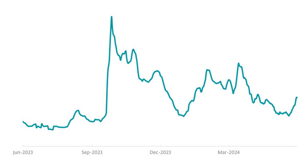 Pie de imagen: Tendencias en las detecciones de JS/Agent desde junio 2023 a mayo 2024, media móvil de 7 días.