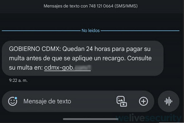 Desde ESET aclaran que el phishing no solamente llega por correo electrónico, sino que puede llegar por sistemas de mensajería como WhatsApp, Telegram, Instagram, e incluso mensajes de texto. Debajo un ejemplo de engaño por SMS.