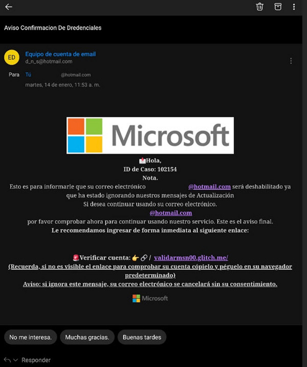 El siguiente es un caso por correo electrónico de las llamadas “estafa de soporte técnico”: