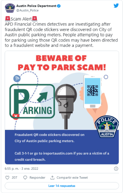 1. Redirigir al usuario a una web maliciosa para robarle información: Al igual que los atacantes emplean técnicas de malvertising o BlackHat SEO para dirigir a sus víctimas a sitios fraudulentos, podrían hacer lo mismo con los códigos QR. Especialmente si estos se encuentran en publicidades en la vía pública o en las áreas de atención al cliente de entidades financieras. Recientemente en Estados Unidos delincuentes colocaron en parquímetros públicos ubicados en distintas ciudades, calcomanías con falsos códigos QR que llevaban a las potenciales víctimas a un falso sitio para supuestamente realizar el pago con el objetivo de robar los datos financieros.