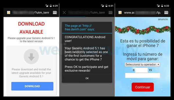 Campañas en redes sociales: Engaños que pretendían permitir cambiar el color de WhatsApp, hacer videoconferencias cuando aún no existía tal funcionalidad o elaborados sistemas de estafas geolocalizadas que funcionaban mediante supuestos cupones de canje fueron algunas de las más notables campañas en teléfonos móviles. El fin usualmente es lograr que el usuario descargue e instale una aplicación, ceda sus datos o termine suscripto a un servicio de mensajería premium por el cual se le cobrará sin su conocimiento.