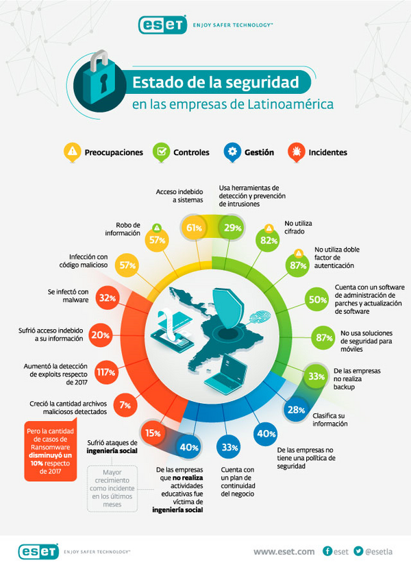 A continuación, se comparte una infografía con algunos de los datos más relevantes que dejó el ESET Security Report 2019 sobre el estado de la seguridad de las empresas de América Latina: