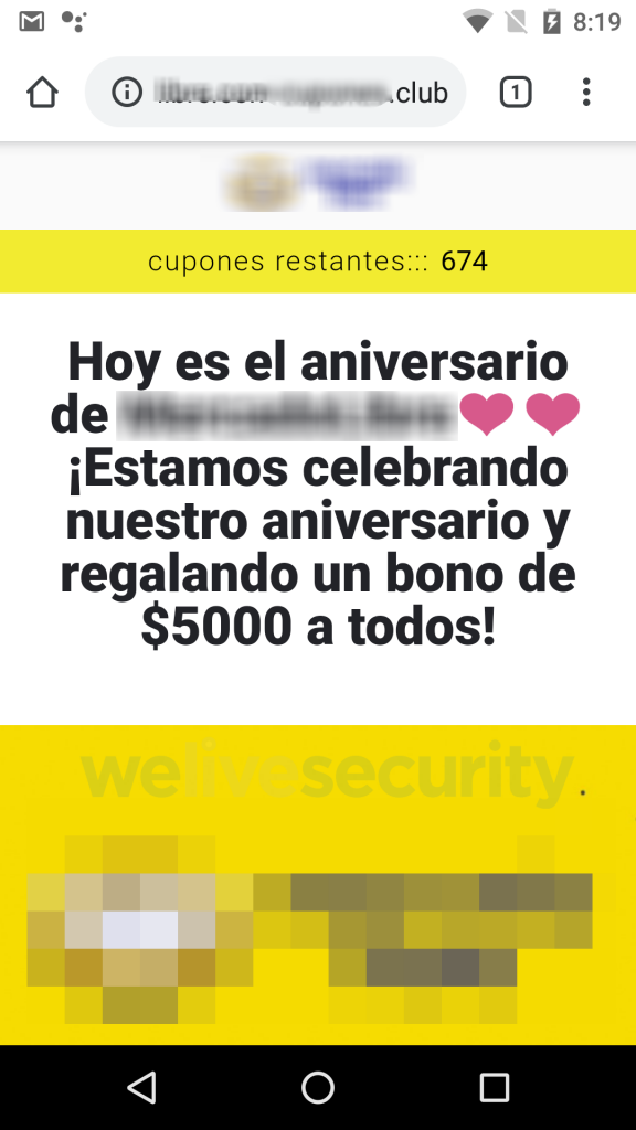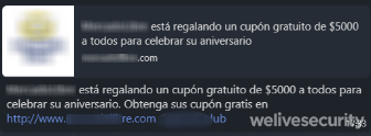 El mensaje que está circulando ofrece supuestos cupones por valor de $5.000 como parte de la celebración del aniversario de la empresa. Cabe destacar también que ESET confirmó la existencia de la misma campaña ofreciendo cupones gratuitos, pero suplantando la identidad de dos conocidas marcas de supermercados en Argentina.