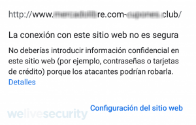Así como ESET siempre recomienda a los usuarios verificar los certificados de las páginas en las cuales añaden datos personales, en este caso también se trata de servidores no seguros. Haciendo clic en el botón de información a la izquierda de la URL, se puede comprobar. Este punto debería hacer desistir al usuario en su deseo de querer avanzar con el ingreso de información personal en cualquier sitio.
