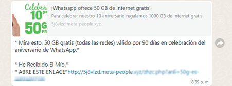 Buenos Aires, Argentina – ESET, compañía líder en detección proactiva de amenazas, detectó una nueva campaña maliciosa que circula a través de WhatsApp que busca hacer creer a los usuarios que WhatsApp celebra su aniversario y que regala 50GB con datos móviles para navegar por Internet. Además de nunca obtener esa cantidad de datos, las víctimas proporcionan a los atacantes su número de teléfono y son redireccionados a otros sitios que buscan instalar adware en sus dispositivos.