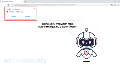 Además de las extensiones de dudosa reputación, otras páginas aparecen en el proceso de redirección de esta campaña. Una de ellas abre una notificación en el navegador solicitando permisos para verificar que no se trata de un robot. Si el usuario otorga permisos, se activarán las notificaciones del navegador y comenzarán a desplegarse anuncios no deseados en el equipo advirtiendo, por ejemplo, que el usuario debe instalar una solución de seguridad porque se han detectado códigos maliciosos en el equipo.
