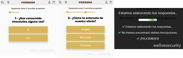 En caso de que una potencial víctima decida continuar para obtener las supuestas tres cajas de chocolates de forma gratuita, deberá contestar una simple encuesta de tres preguntas. Al completarla, un supuesto proceso de verificación de las respuestas se muestra al usuario