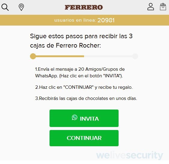 Buenos Aires, Argentina – ESET, compañía líder en detección proactiva de amenazas, alerta que está circulando a través de WhatsApp un engaño que pretende convencer a los usuarios de que la compañía Ferrero Rocher está regalando cajas de chocolate. El objetivo de los operadores detrás de esta campaña maliciosa es dirigir a los usuarios a páginas no deseadas y robar información personal.