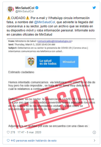 - Campaña en Colombia suplanta identidad del Ministerio de Salud: Una de las alertas más recientes fue comunicada por el Ministerio de Salud de Colombia, quien a través de su cuenta de Twitter advirtió la existencia de una campaña que circula por correo electrónico y por WhatsApp, suplantando la identidad del Ministerio de Salud, en la que envían un adjunto (archivo PDF) para distribuir un código malicioso que se instala en el dispositivo de la víctima. El objetivo de esta campaña es robar información personal, asegura el organismo de salud colombiano.