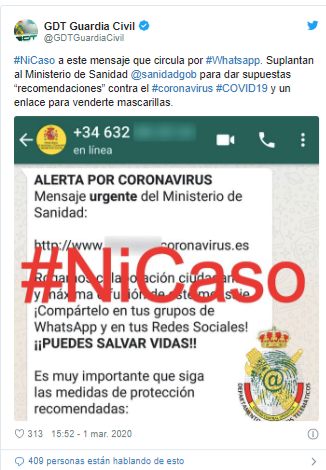 - Campaña en España simula ser el Ministerio de Sanidad: La Guardia Civil en España alertó a los usuarios a través de su cuenta de Twitter sobre una campaña que al parecer solo circula por WhatsApp, en la que se suplanta la identidad del Ministerio de Sanidad para compartir recomendaciones relacionadas sobre este virus. El mensaje incluye una URL en la que supuestamente se venden mascarillas o barbijos, cuando en realidad lo que busca la campaña es robar datos personales de las víctimas.