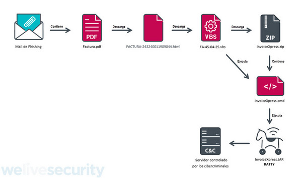 La campaña maliciosa comienza con un correo de phishing que incluye un archivo adjunto llamado Factura.pdf que induce a la víctima a hacer clic en un enlace que produce la descarga de un archivo HTML (FACTURA-243240011909044.html), que a su vez descarga un script VBS (FA-45-04-25.vbs). Este script, al ser ejecutado, facilita la descarga de un archivo comprimido (InvoiceXpress.zip), dentro del cual se encuentra un archivo (InvoiceXpress.cmd) encargado de ejecutar InvoiceXpress.jar, identificado como el troyano de acceso remoto Ratty, que además establece conexión con un servidor de comando y control.