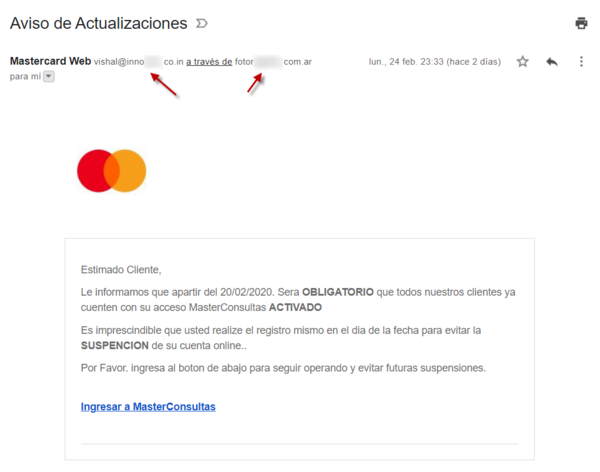 Imagen 1. Correo que llega a la potencial víctima imitando la identidad de Mastercard.