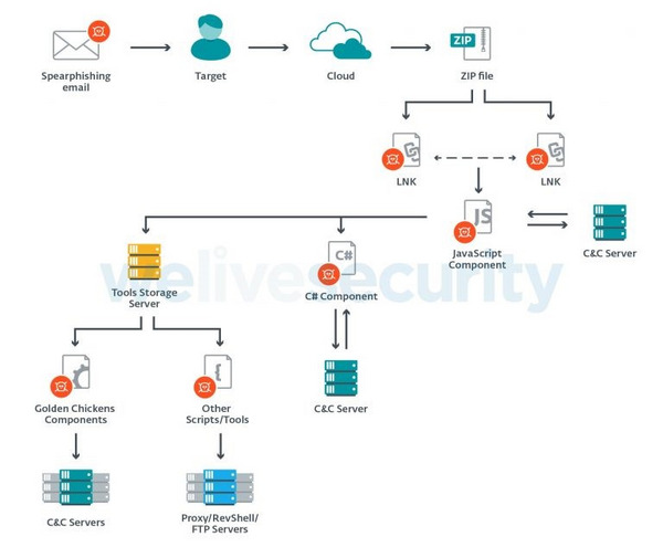 El componente JavaScript es la primera etapa del ataque y puede distribuir otro malware, como un componente espía o varias herramientas basadas en Python. Cada uno de los diversos componentes tiene su propio servidor C&C, y cada componente funciona de manera independiente. Los operadores del malware envían comandos manualmente para instalar componentes adicionales y usan scripts y herramientas post-compromiso en caso de considerarlo necesario.