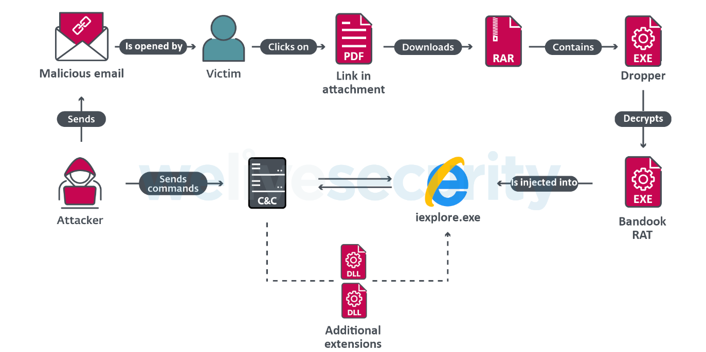 El ataque comienza con correos electrónicos que incluyen un archivo PDF malicioso como adjunto y que son enviados a los blancos de ataque. El archivo PDF contiene un enlace para descargar un archivo comprimido y la contraseña para extraerlo. Dentro del archivo hay un ejecutable: un dropper que inyecta Bandook en un proceso de Internet Explorer.