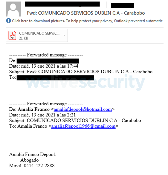 Los correos electrónicos que contienen estos archivos adjuntos suelen incluir mensajes breves. El número de teléfono en la parte inferior del mensaje es un número de teléfono móvil en Venezuela, pero desde ESET aseguran que es poco probable que esté relacionado de alguna manera con los atacantes.