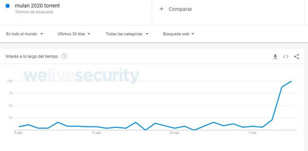 Tras el lanzamiento de la película Mulán por parte de Disney a través de su plataforma Disney +, el sitio TorrentFreak, que analiza semanalmente cuáles son las películas pirateadas más descargadas de la semana en sitios de Torrent, asegura que Mulán se convirtió rápidamente en la película más descargada. Según datos de la telemetría de ESET y principalmente tras el lanzamiento, crecieron las detecciones de archivos maliciosos que incluían el nombre de la película en Torrents.