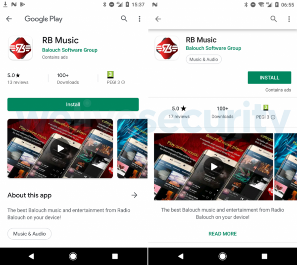 La aplicación maliciosa, llamada Radio Balouch, también conocida como RB Music, es en realidad una aplicación de transmisión de radio totalmente funcional. El inconveniente está en que contiene una funcionalidad oculta que es el robo de datos personales de sus usuarios. ESET identificó en dos oportunidades versiones de la app maliciosa en Google Play, y en cada caso, la app presentaba más de 100 instalaciones. La misma fue eliminada rápidamente por Google en ambas ocasiones después de ser alertada por a la empresa.