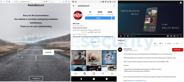 Imagen 2. El sitio web de Radio Balouch (izquierda), cuenta de Instagram (centro) y video promocional de YouTube (derecha)