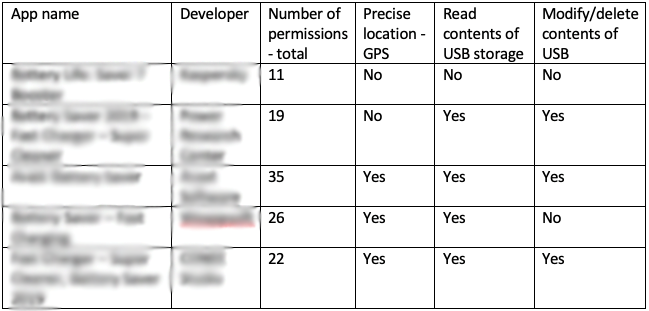 Desde ESET se aconseja tener en cuenta que al descargar una aplicación hay distintas opciones. Para demostrar las diferencias entre las aplicaciones que proporcionan una funcionalidad similar y los permisos solicitados, los investigadores de la compañía buscaron: “ahorro de batería” en la tienda Google Play. A continuación, se muestra una tabla con detalles de las primeras cinco aplicaciones en el orden en que aparecieron: