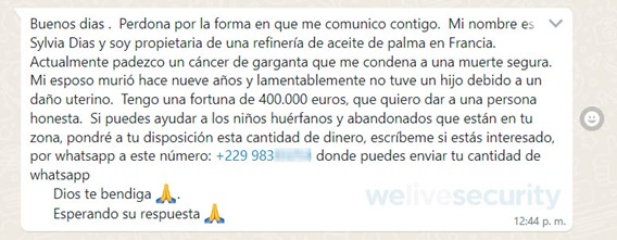 En este caso, la potencial víctima fue contactada a través Telegram desde un número que comenzaba con el prefijo +229. De acuerdo al código de área internacional corresponde a Benín. Un país ubicado en el oeste de África. El mensaje decía ser de una mujer, dueña de una compañía en Francia, que aseguraba estar enferma de cáncer y que estaba interesada en dejar una herencia de 400.000 euros a una persona dispuesta a ayudarla a donar ese dinero para causas benéficas. Supuestamente, la empresaria había revisado sus perfiles en redes sociales y había llegado a la conclusión de que era una persona honesta en la cual podía confiar su dinero.