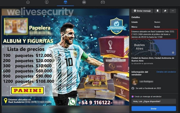 Buenos Aires, Argentina – Desde ESET, compañía líder en detección proactiva de amenazas, analizan el caso reciente de un comercio que se vio involucrado, sin saberlo, en una estafa vinculada con el álbum de figuritas de la Copa del Mundo. Los estafadores están utilizando el nombre, la dirección física del comercio y las imágenes que figuran en Google Maps para crear un falso perfil en Marketplace y ofrecer figuritas a un precio atractivo, con el objetivo de robar el dinero de las víctimas.