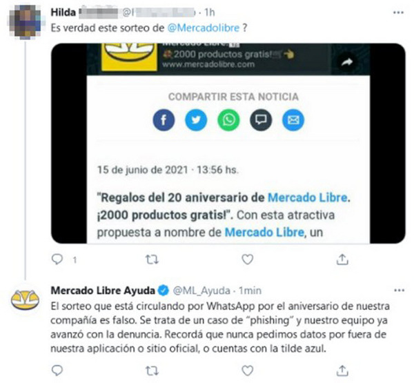 Falso sorteo de productos devueltos de Mercado Libre: También circuló en WhatsApp una estafa que suplanta la identidad de Mercado Libre y busca convencer a potenciales víctimas de un sorteo de productos que fueron devueltos. Tras algunos pasos previos para reclamar el premio, la víctima debe enviar a sus contactos el supuesto sorteo: así la campaña logra en poco tiempo un alto alcance. Luego, la víctima es dirigida a un sitio que utiliza técnicas de ataques conocidos como scareware, para hacerle creer que su dispositivo está en peligro, y desplegar publicidad fraudulenta, recolectar datos o descargar malware.