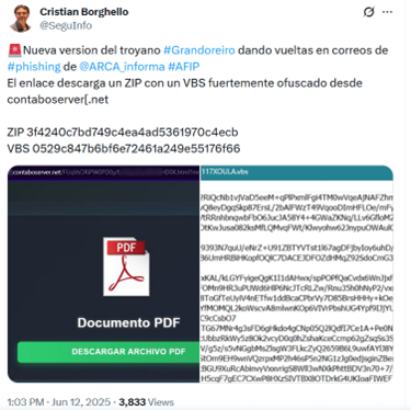 Diversos usuarios compartieron ejemplos de correos que recibieron como parte de esta misma campaña que utiliza el nombre de AFIP, con una supuesta multa como señuelo. En un caso compartido por el especialista Cristian Borghello, el enlace descarga un ZIP con un archivo “.vbs” fuertemente ofuscado.
