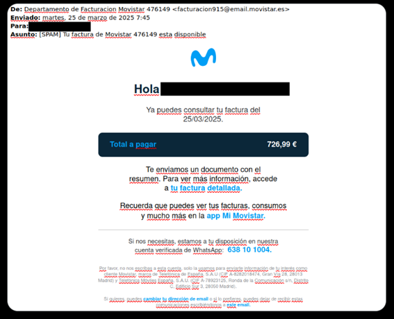 Otro ejemplo similar es el compartido por Josep Albors, ejecutivo de ESET, que data de marzo de 2025. Puntualmente, esta campaña que distribuye el troyano bancario Grandoreiro, está dirigida a España y suplanta la identidad de la compañía telefónica Movistar.